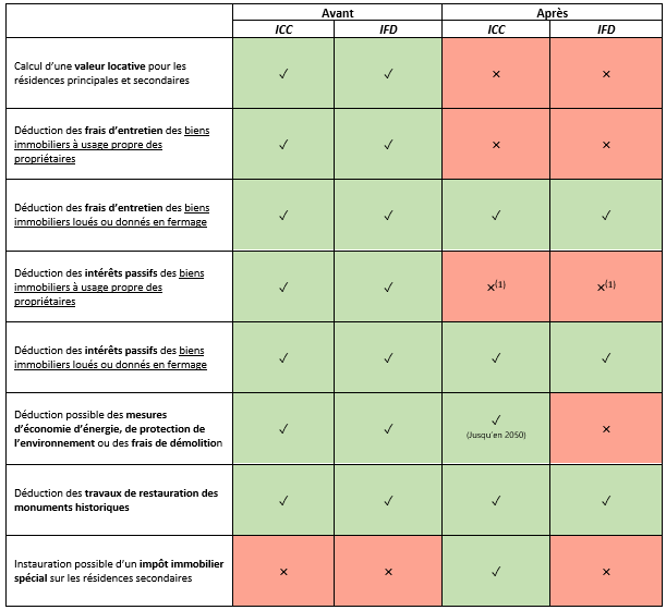 - Aux niveaux fédéral (IFD) et cantonal (ICC), seule la déduction relative à la préservation des monuments historiques reste possible ;